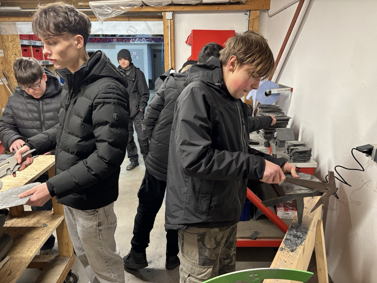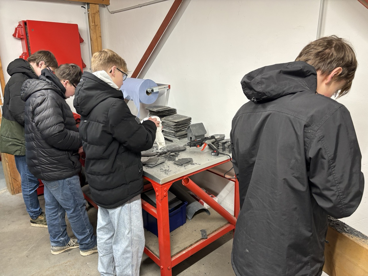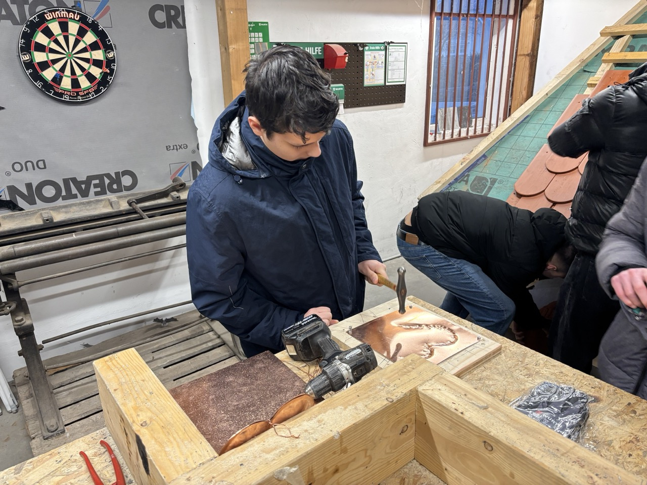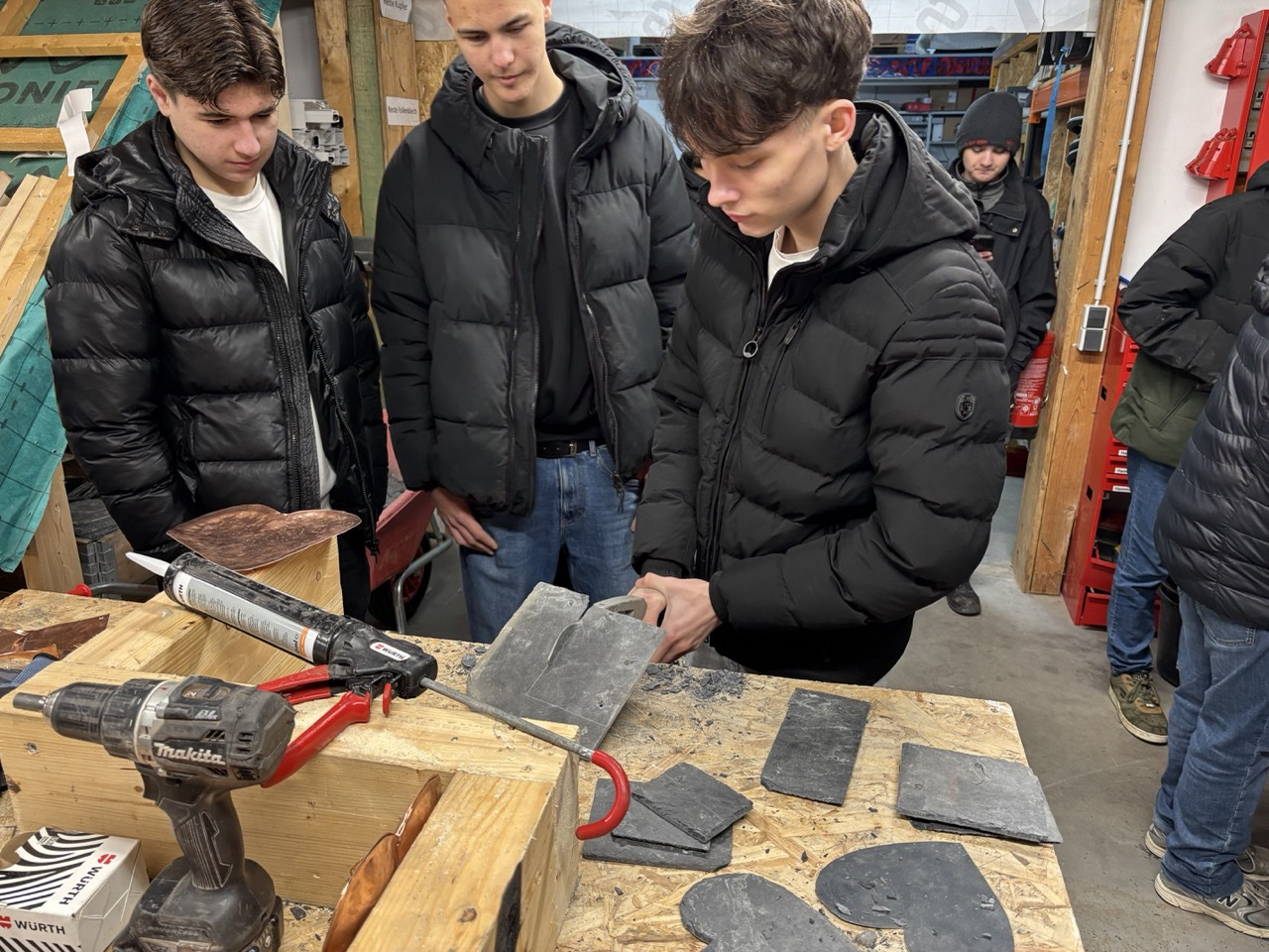 Im Anschluss folgte ein Rundgang durch das Lager des Betriebs. An verschiedenen Stationen konnten die Schülerinnen selbst aktiv werden und praktische Übungen ausprobieren. Mit großer Begeisterung und viel Engagement nutzten sie die Gelegenheit, typische Tätigkeiten des Dachdeckerhandwerks kennenzulernen und sich praktisch zu erproben.